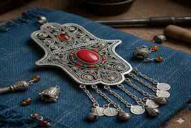 Traditional Berber silversmiths create large, ornate Khamsa pendants with intricate filigree work, coral or amber inlays, and dangling elements. These pieces are often family heirlooms, passed down through generations. The silver is hand-hammered and oxidized for an antique finish.