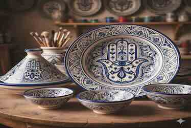 Fez is renowned for its cobalt blue pottery featuring hand-painted Khamsa designs. Artisans use traditional techniques dating to the 9th century, creating plates, tajines, and decorative pieces with intricate geometric patterns surrounding the hand symbol. The distinctive Fez blue is created from natural cobalt oxide.