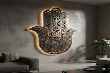 Contemporary metal artists create large-scale Khamsa wall sculptures from copper, steel, or aluminum. These pieces, popular in modern interior design, range from minimalist outlines to elaborate 3D constructions with intricate cut-out patterns.