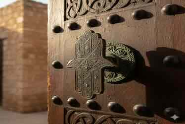 Perhaps the most iconic architectural use of the Khamsa is the hand-shaped door knocker found throughout Morocco's medinas. Cast in bronze or brass, these functional amulets serve a dual purpose: summoning inhabitants and warding off evil from entering the home. The tradition dates back centuries.