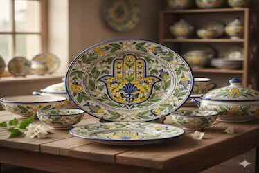 The Tunisian town of Nabeul specializes in hand-painted ceramics with Khamsa motifs. Plates, bowls, and serving dishes feature the hand surrounded by jasmine flowers (Tunisia's national flower), fish, and Arabic calligraphy. The style is characterized by bright yellows, greens, and blues.
