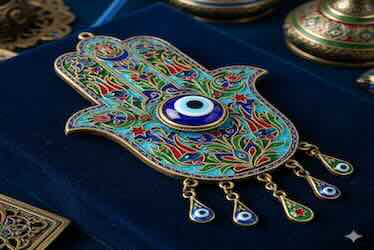 Khamsa motifs adorn functional objects—plates, bowls, lamps, mirrors, and decorative vessels. These objects bring protection into daily life, transforming mundane activities like dining or grooming into spiritually charged rituals.