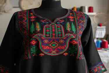 Palestinian women embroider Khamsa motifs onto traditional thobes (dresses) using cross-stitch technique. The hand appears alongside cypresses, birds, and geometric patterns in vibrant reds, greens, and oranges. These garments are cultural treasures, with regional variations indicating the wearer's village of origin.
