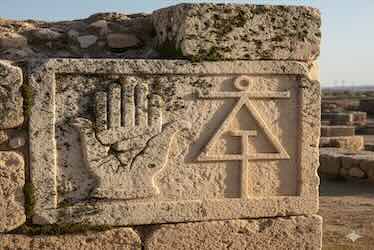 Excavations at Carthaginian temples dedicated to Tanit reveal hand symbols carved into stone. These proto-Khamsas show an open palm with five fingers, often accompanied by the triangular "Sign of Tanit." These are among the earliest representations of the protective hand motif.