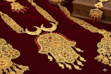 In Tunisia, the Khamsa is called "Khoumissa." Traditional Tunisian gold jewelry features the hand combined with fish (another protective symbol), crescents, and coral beads. These pieces are elaborate and heavy, designed for special occasions like weddings.
