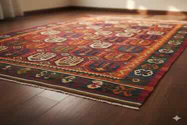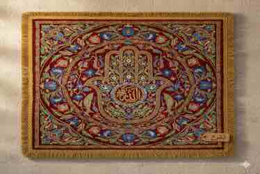 Turkish kilim (flat-woven) rugs incorporate stylized hand symbols called "Elibelinde" (hands on hips), which are protective fertility symbols. While not identical to the Khamsa, they represent the same tradition of using hand imagery for protection. These rugs feature bold geometric designs in reds, blues, and golds.